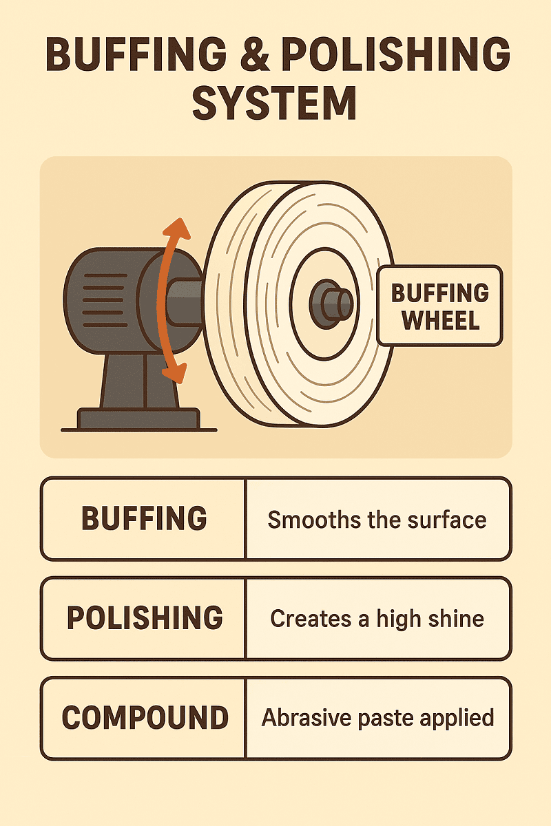 Buffing and polishing are mechanical processes used to smooth metal surfaces to achieve finishes ranging from matte to mirror-like. Buffing utilizes a soft cloth wheel and fine abrasive compounds to create a high-gloss finish. Polishing is a more aggressive process that uses an abrasive wheel to remove a thin layer of the surface, correcting imperfections and producing a brighter, more polished finish.